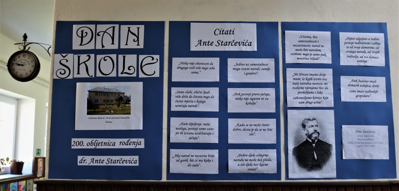 Povodom dvjestote obljetnice rođenja dr.Ante Starčevića – Oca domovine i našeg Dana škole odradili smo niz aktivnosti kojima smo obilježili ovaj povijesni trenutak. S ponosom ističemo kako naša škola nosi ime ovog velikana koji je prema nekim podacima i sam pohađao ovu školu. U želji da ostane ovaj dan zapisan na stranicama hrvatske povijesti učenici i učitelji su se potrudili da na dostojanstven i svečan način obilježe naš Dan škole.